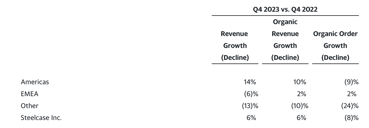 "In the Americas, our fourth quarter orders were stronger than we anticipated and drove revenue and earnings above our expectations," said Sara Armbruster, president and CEO. "Although our fourth quarter orders were below the prior year, project business from large corporate customers improved sequentially from the third quarter. We’ve seen opportunity creation in the Americas grow on a year-over-year basis for eight of the last nine months, and in recent months, a notable number of larger companies in the United States have announced workplace strategies that emphasize the importance of an in-office presence."